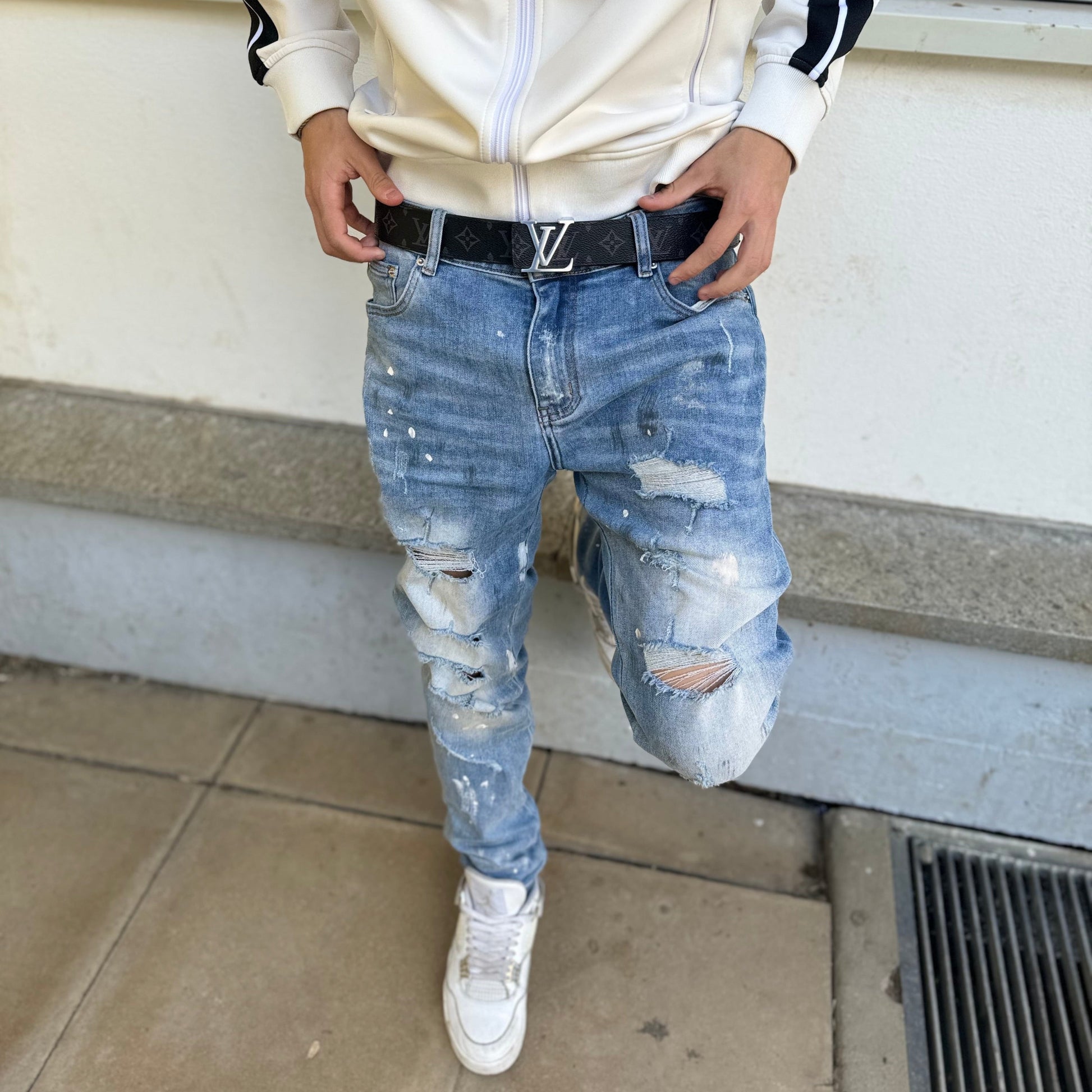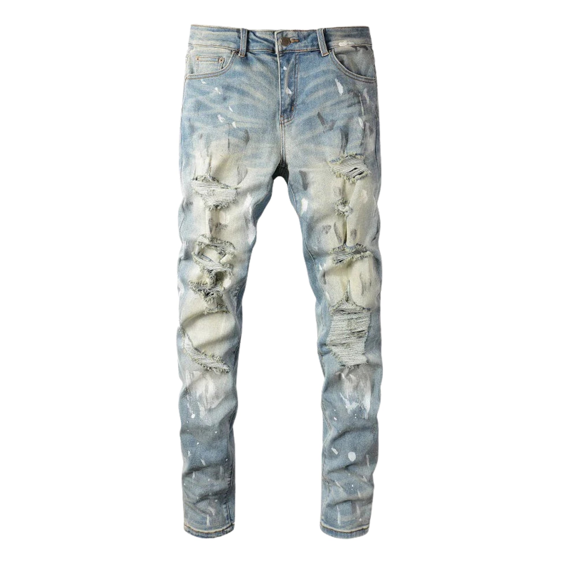 UNLOCK YOUR DRIP. The Celumi jeans come in a light blue wash with bold ripped details and white paint-splatter effects. The frayed edges add a rugged touch, while the sturdy denim keeps them strong and ready for everyday wear.