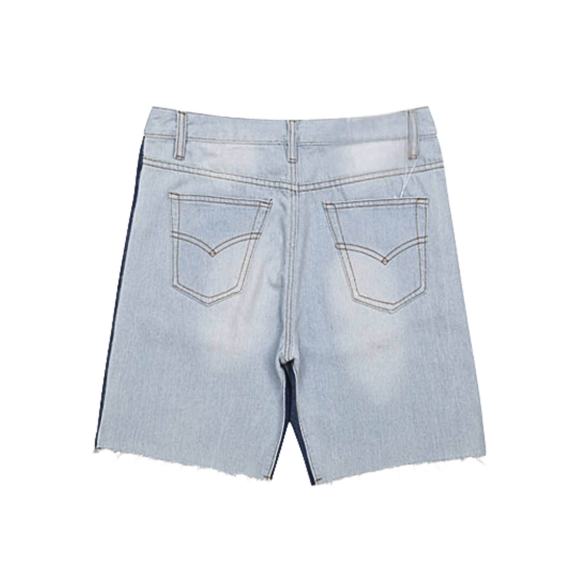 UNLOCK YOUR DRIP. These two-tone denim shorts combine light and dark indigo panels for a bold contrast. Finished with raw hems, they’re easy to wear and stand out for summer fits.
