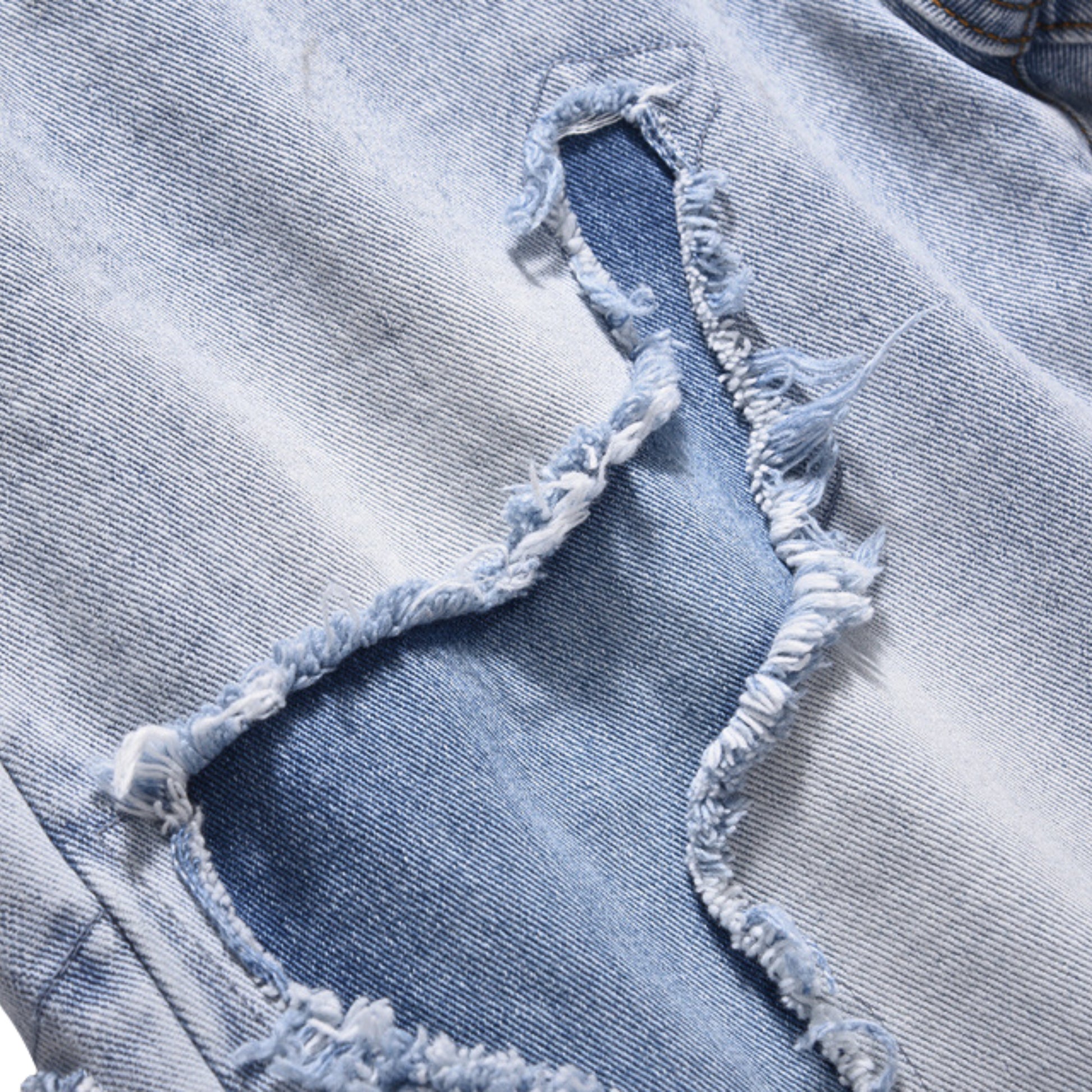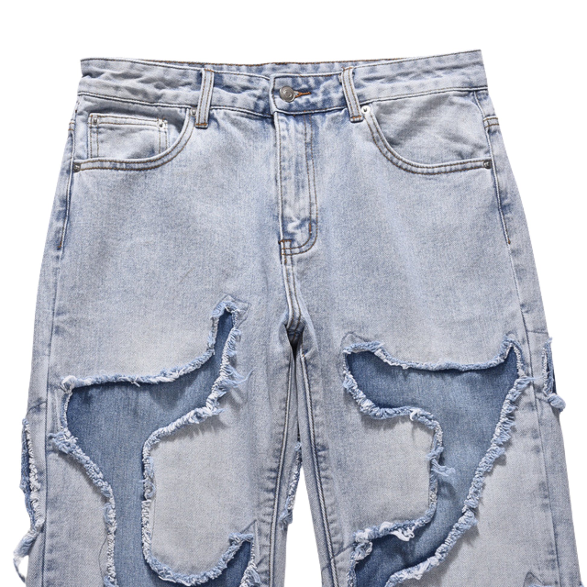 - Two-tone stitched denim with ripped overlays