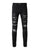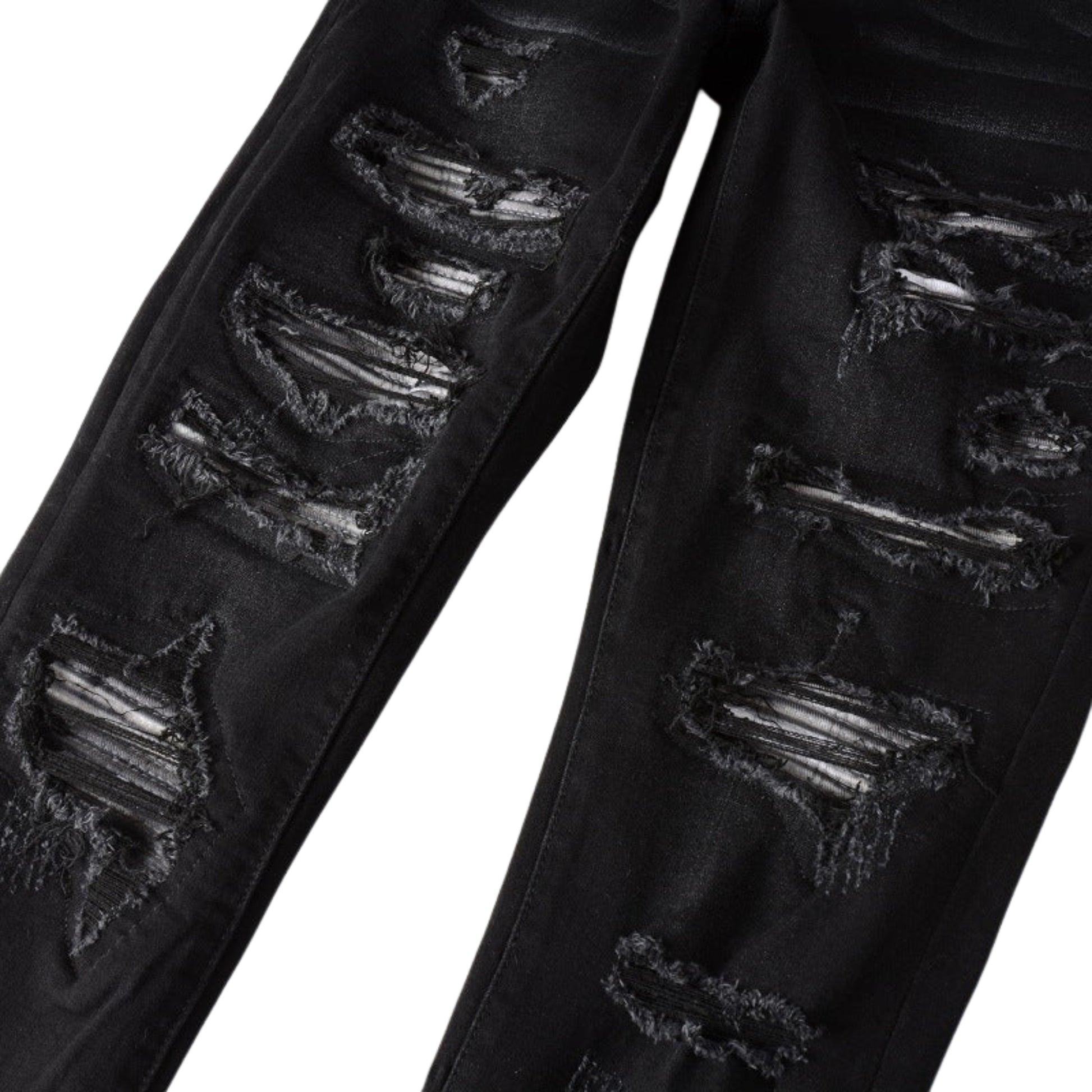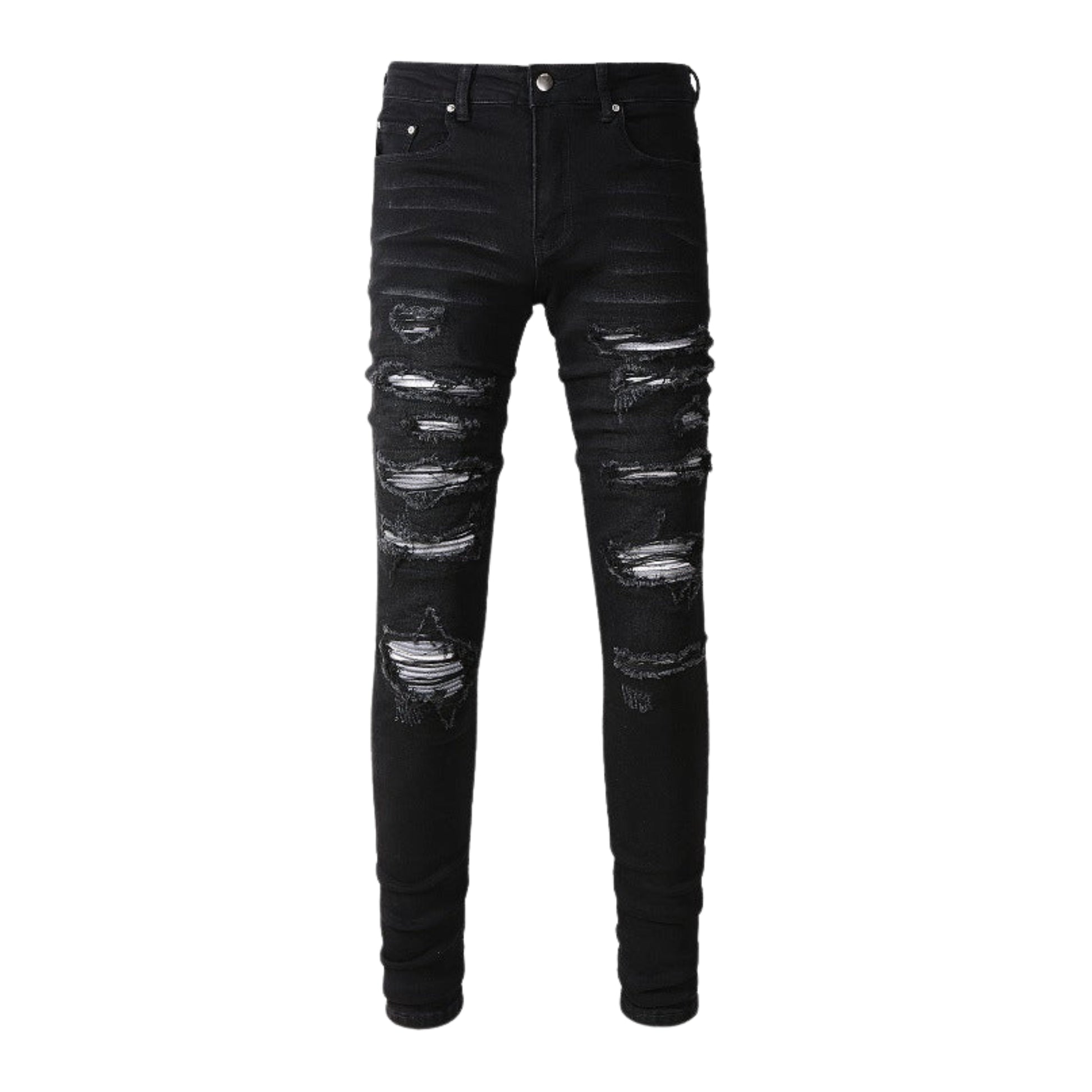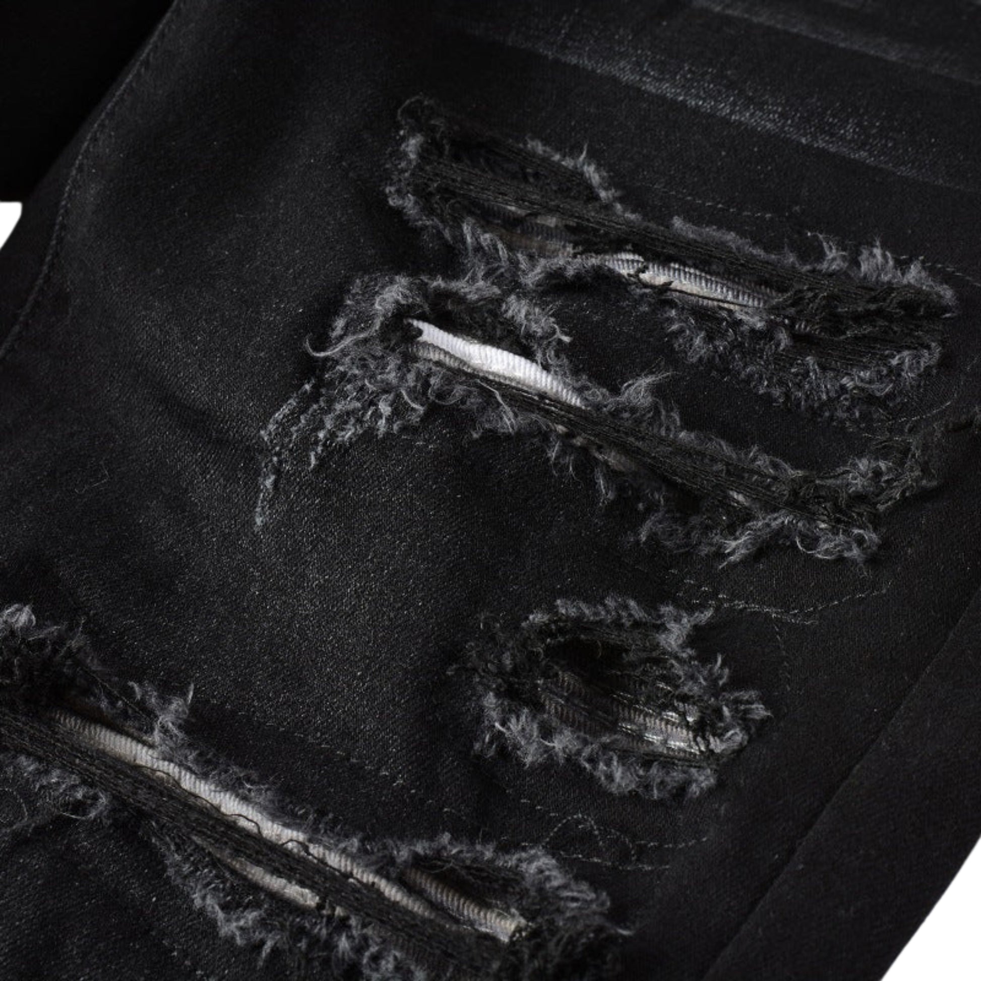 UNLOCK YOUR DRIP. The Nero jeans come in a deep black wash with bold ripped details across the thighs and knees. The distressed cuts reveal textured white underlays, creating a sharp contrast against the dark base. Made from durable denim with a slim fit, they deliver rugged streetwear style with everyday comfort.