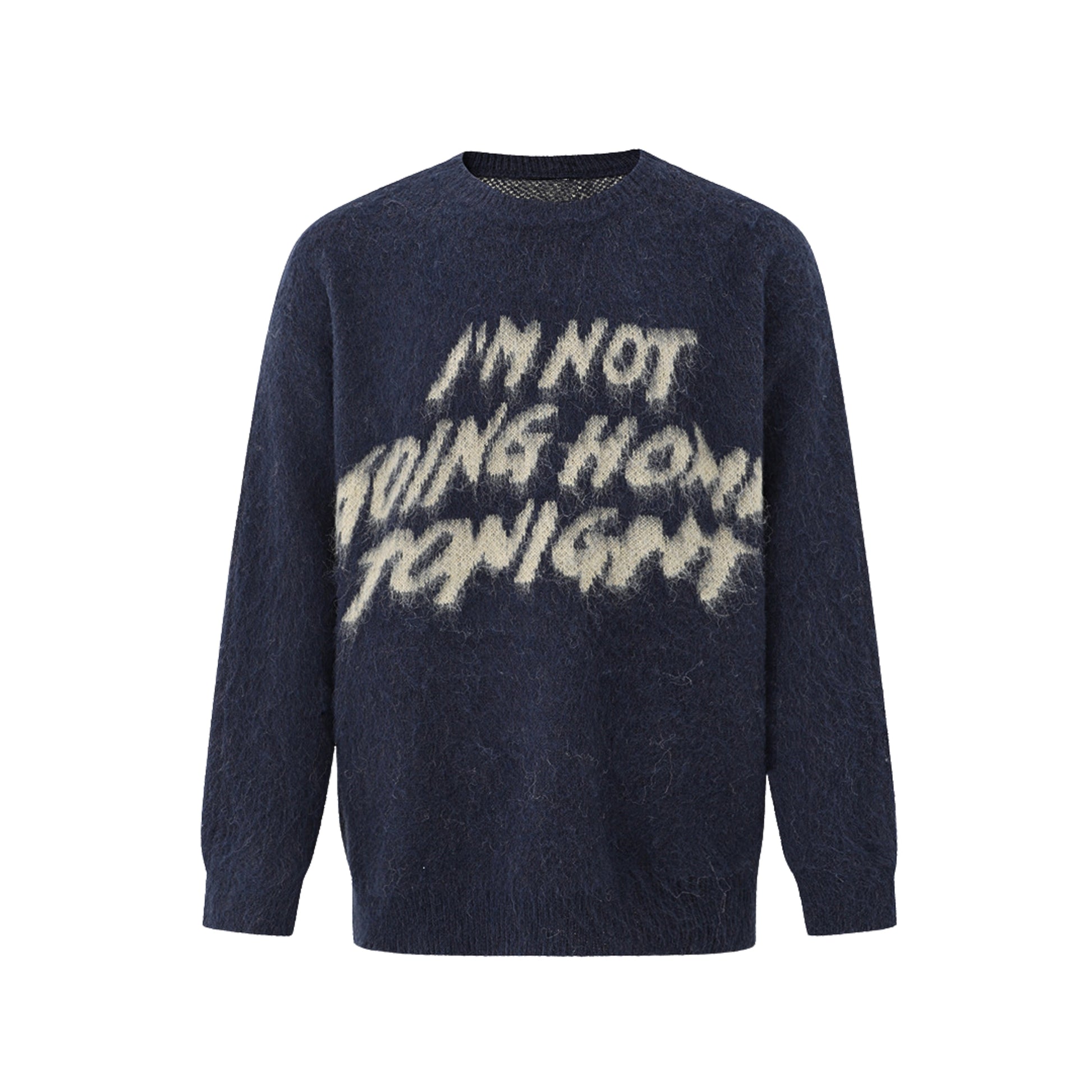 UNLOCK YOUR DRIP. A cozy sweater with attitude. Made from a soft fuzzy knit, it features the bold phrase “I’m Not Going Home Tonight” splashed across the front. Easy to throw on, super comfortable, and perfect for when you want your outfit to do the talking. Available in brown, pink, and navy for different moods.