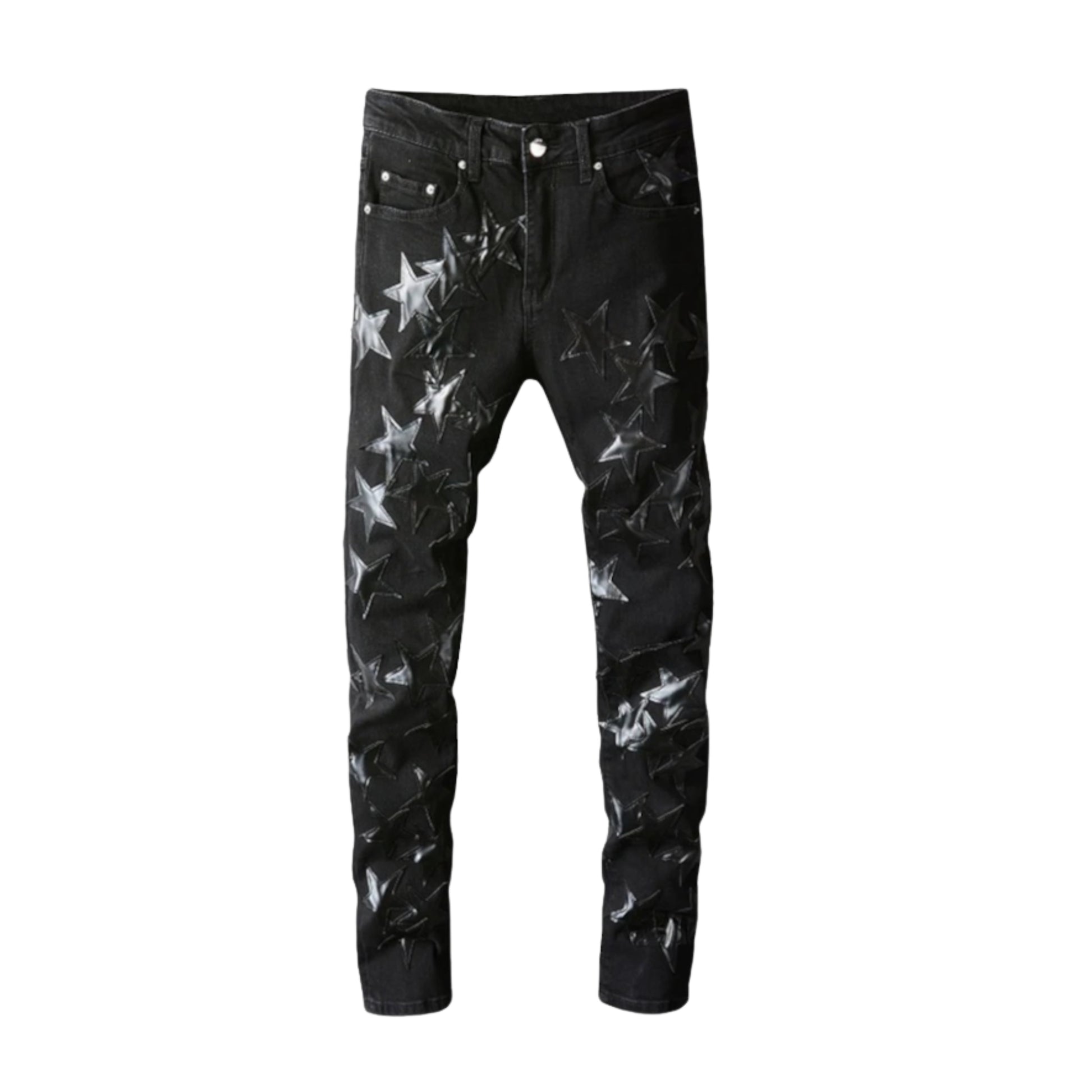 UNLOCK YOUR DRIP. The Stella jeans are a bold statement piece, finished in deep black denim covered with glossy star prints. The all-over star pattern adds a striking contrast and futuristic edge, while the slim fit keeps them sharp and wearable. Built with durable fabric, they blend standout design with everyday comfort.